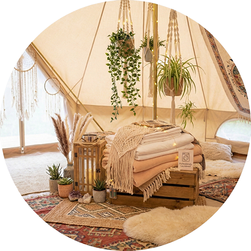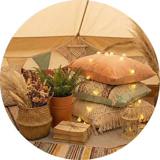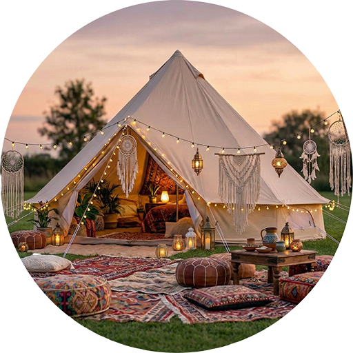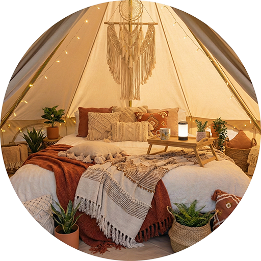 We don't do "camping." We create private sanctuaries. A weatherproof 16ft bell tent furnished with hotel-grade mattresses, vintage textures, and a rhythm all its own.