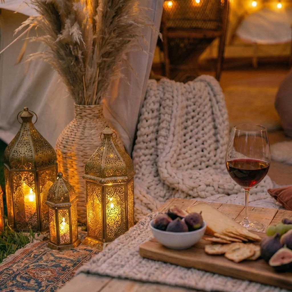 • Ambient Lighting: Lanterns and fairy lights for a deep amber glow.